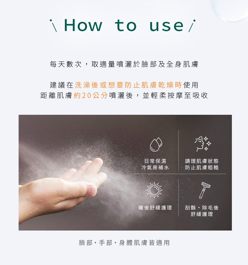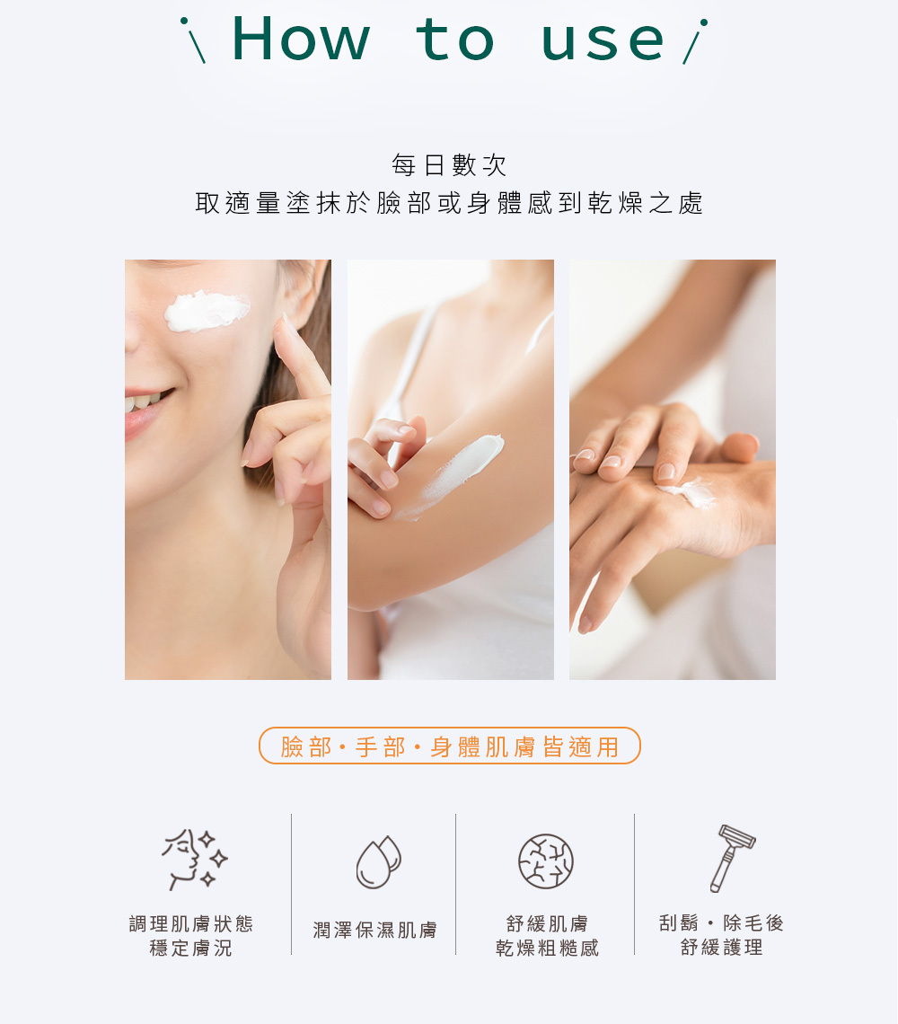 .全能修護:防止乾燥、調理肌況、除毛後護理等