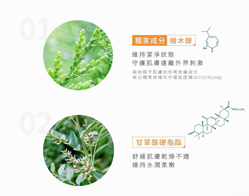 .甘草胺酸X檜木醇,潔淨肌膚守護健康狀態